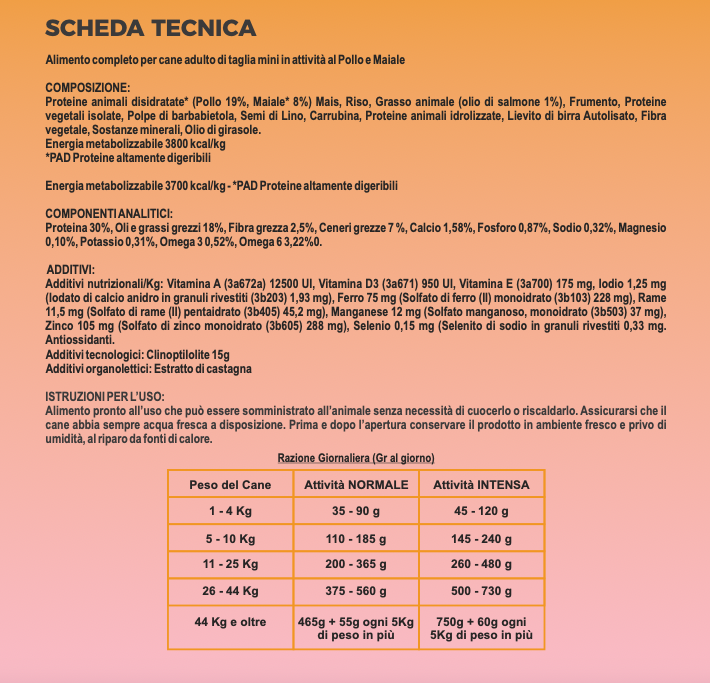 Oli e grassi vegetali (Olio di germe di Mais), lieviti inattivati (lievito di birra), proteine animali idrolizzate (origine avicola), olio di pesce (60% DHA, 10% EPA) 4%, colostro in polvere 2%, mono-, di- e trigliceridi di acidi grassi (acido palmitico), lattoferrina 0,5%, gluconato di calcio 0,5%, gluconato di magnesio 0,5%, maltodestrina, amido di mais, saccarosio, acidi grassi esterificati con glicerolo (acido caprilico, acido caprico).ย ADDITIVI: Additivi nutrizionali: Vitamine:ย 3a700 Vitamina E (tutto-rac-alfa-tocoferil acetato) 6.000 mg/kg, 3a820 Vitamina B1 (Tiamina cloridrato) 30 mg/kg, 3a315 Niacinamide 30 mg/kg, 3a831 Vitamina B6 (Piridossina cloridrato) 25 mg/kg, 3a825i Vitamina B2 (Riboflavina) 12,5 mg/kg, 3a835