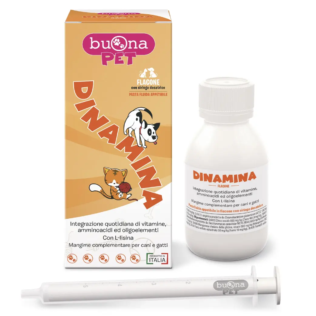 Dinamina Flacone รจ una pasta fluida appetibile indicata per lโ€™integrazione quotidiana della dieta di cani e gatti con micronutrienti essenziali e supportare il sistema immunitario.
