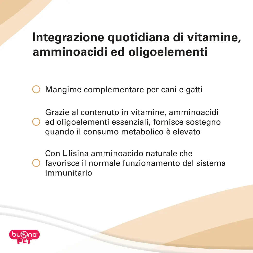 Dinamina Flacone fornisce un apporto bilanciato di nutrienti essenziali per il benessere dellโ€™animale. Contieneย L-lisina, un aminoacido importante per la crescita, lo sviluppo muscolare e il sistema immunitario. Le vitamine, gli amminoacidi e gli oligoelementi contribuiscono a mantenere il fisiologico stato di benessere.