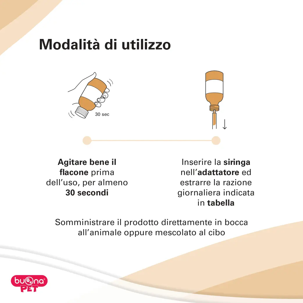 • Somministrare il prodotto direttamente in bocca allโ€™animale o disperso nel cibo gradito.