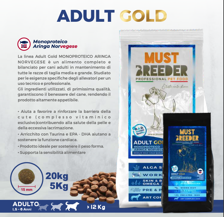 La linea Adult Gold MONOPROTEICO ARINGA NORVEGESE è un alimento completo e bilanciato per cani adulti in mantenimento di tutte le razze di taglia media e grande. Studiato per le esigenze specifiche degli allevatori per un uso tecnico e professionale.