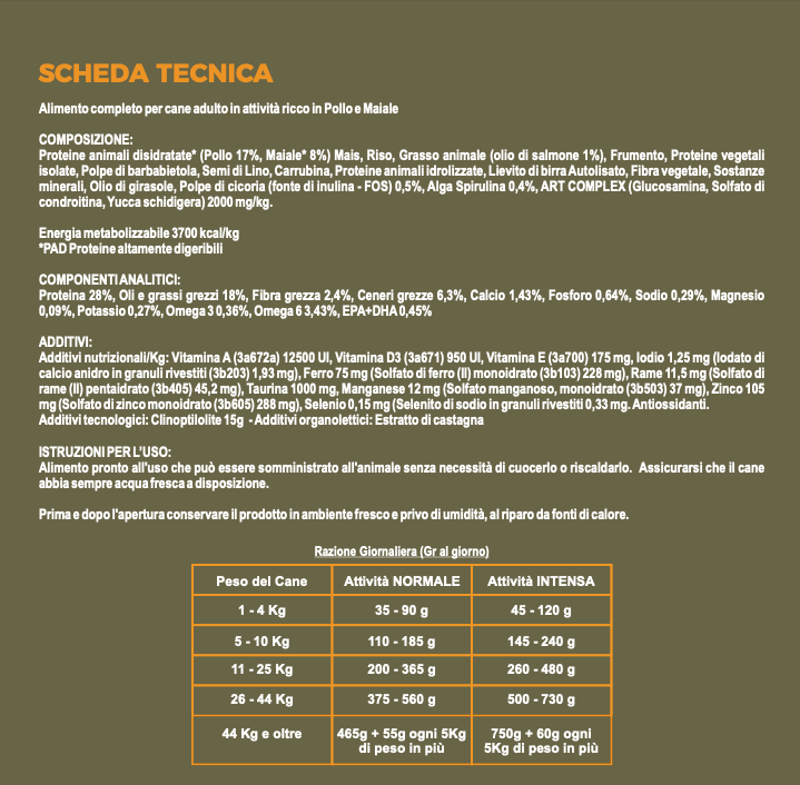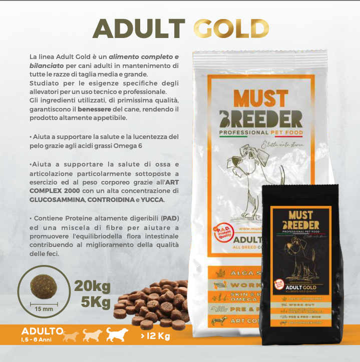 La linea Adult Gold eฬ un alimento completo e bilanciato per cani adulti in mantenimento di tutte le razze di taglia media e grande. Studiato per le esigenze specifiche degli allevatori per un uso tecnico e professionale. Gli ingredienti utilizzati, di primissima qualitaฬ, garantiscono il benessere del cane, rendendo il prodotto altamente appetibile.
